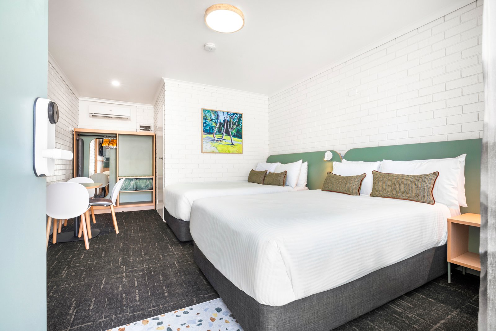 Cosy room with queen and single beds, fridge, coffee pod machine and smart TV — ideal for solo travellers or small pairs. Pet-friendly and close to local cafes and trails.